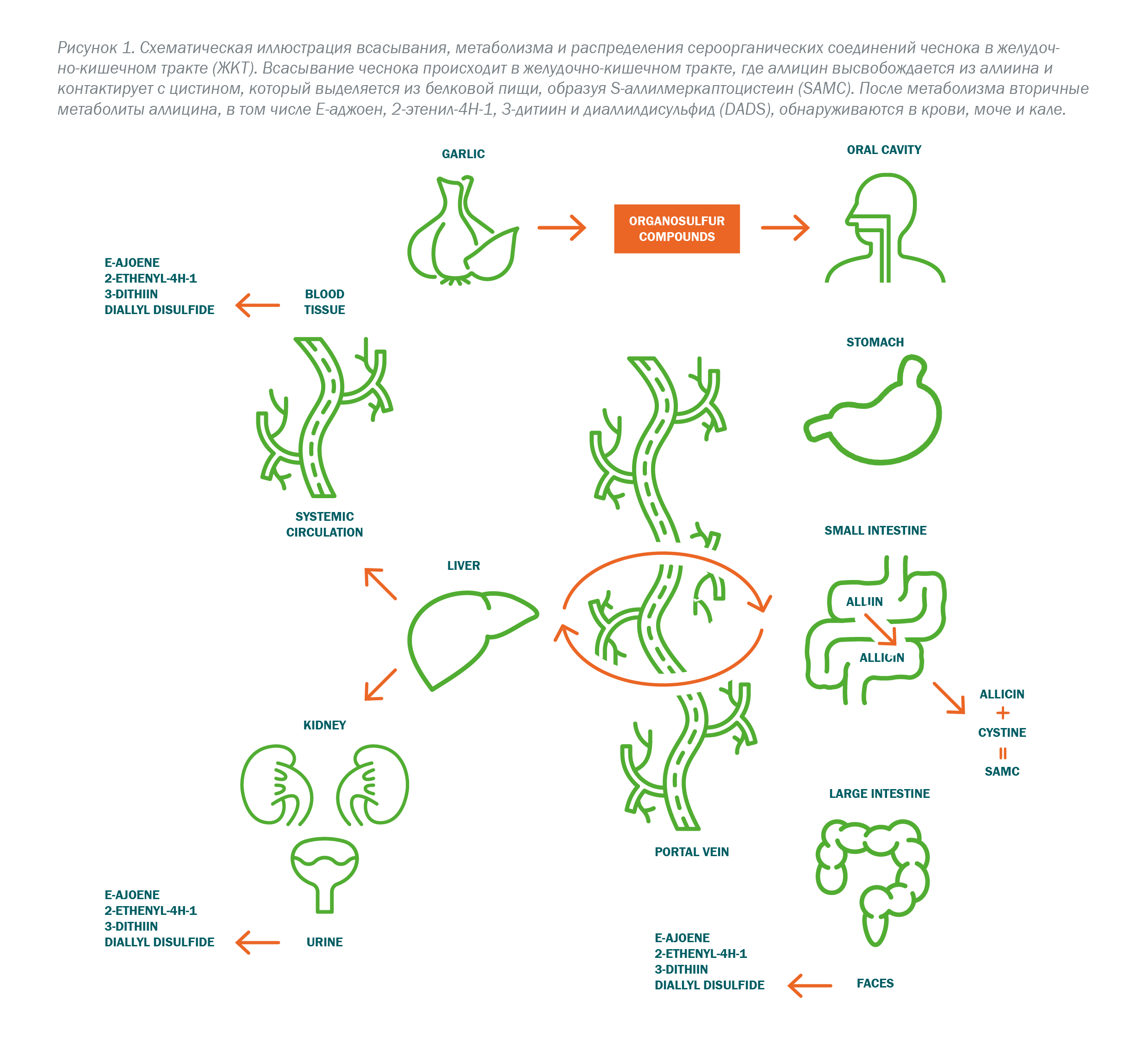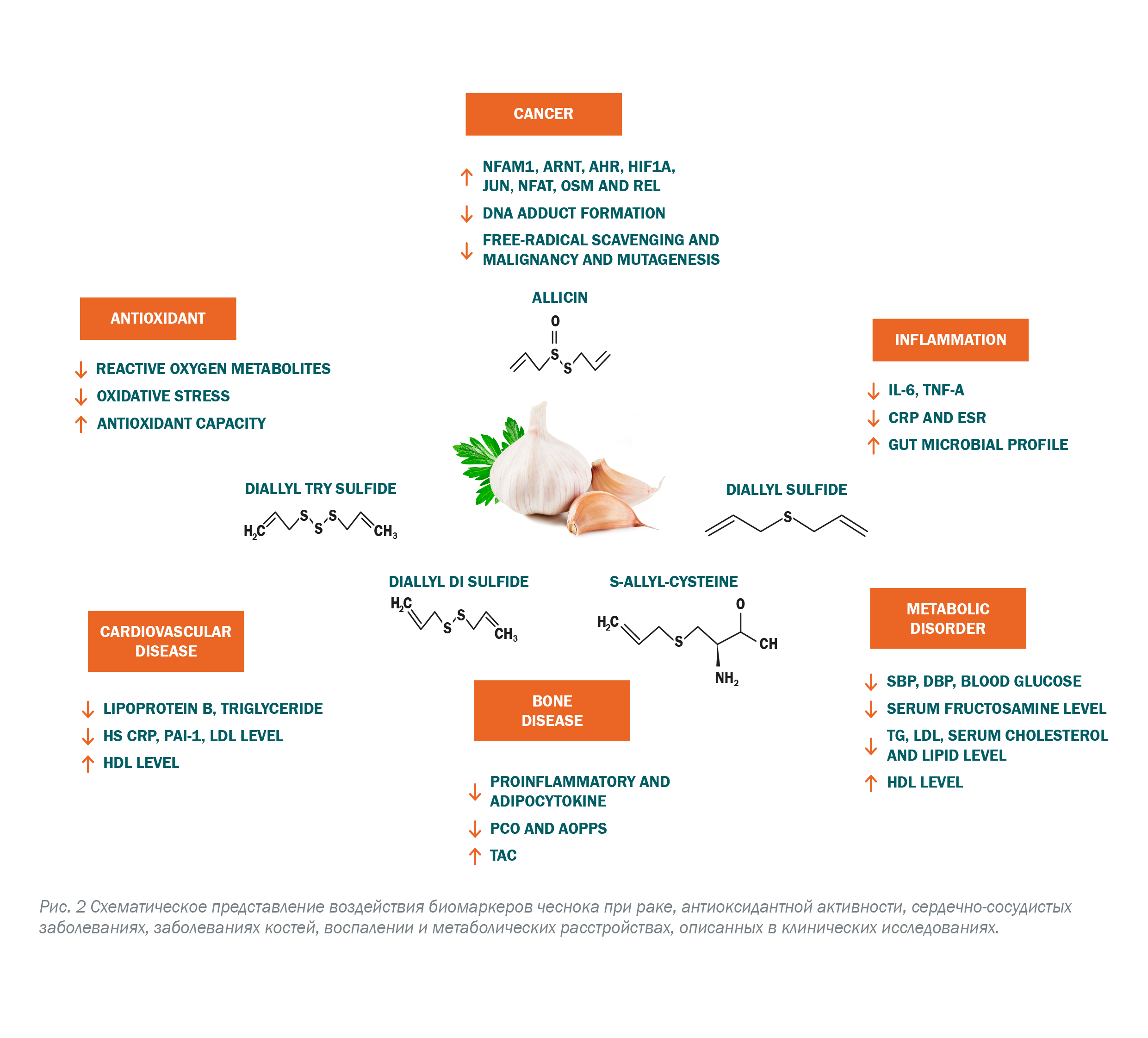 Трансформирующий фактор роста бета 1 (TGF-β1), TGF-β тип II рецептор, psmad 2/3, smad4 и smad [8,9], цитокины, молекулы межклеточной адгезии [10], рецептор-зависимый латентный фактор транскрипции, локализованный в клеточной цитоплазме [11], 5'АМФ-активируемая протеинкиназа [12], васкулоэндотелиальный фактор роста [13], циклооксигеназа-2, индуцибельная синтаза оксида азота, Akt/mTor [14] и Keap1 [15], что в свою очередь ведет к повышению противовоспалительных и антиоксидантных свойств, а так же оказывает химиопрофилактическое, антипролиферативное, анти-ангиогенное, противодиабетическое и кардиопротективное действие. Однако, следует иметь ввиду, что указанные составляющие обладают низкой доступностью. Например, в рандомизированном контролируемом исследовании описано, что после перорального приема от 1 до 3 г порошка чеснока сухого, в моче через 6 и 24 часа не были обнаружены сераорганических соединений диаллилдисульфида (DADS) и диаллилсульфида (DAS) ]16]. Кроме того, аллилтиосульфаты, содержащиеся в препарате чеснока, подвергаются активному метаболизму с образованием аллилметилсульфида, который в основном присутствует в дыхании [17].